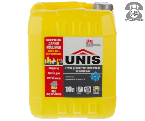 Грунтовка Юнис (Unis) Для внутренних работ 10 л: продажа в Воронеже. Цена, характеристики, параметры. Телефоны, адреса, сайты реализующих фирм.